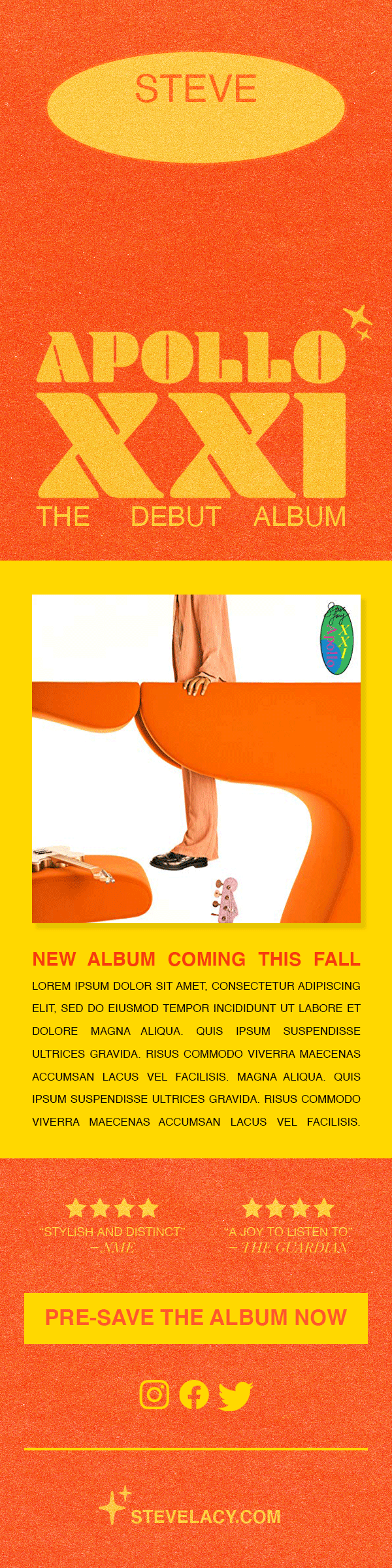 This concept design draws inspiration from Steve Lacy’s debut album, Apollo XXI. I created a series of social graphics intended to generate buzz ahead of the launch, channeling the aesthetic of 70s music posters. Each graphic features a print-on-paper ink effect and a color palette reflective of that era. (Note: This project was purely a concept and was not commissioned by the artist.)